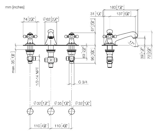 Смеситель для раковины, Dornbracht, Madison, тип открывания воды-вентильный, тип регулирования воды-керамическая кран-букса, монтаж-на раковину/столешницу, отверстия для монтажа-3, высота, мм-72, вынос излива, мм-135, тип излива-неподвижный, донный клапан-есть, тип подводки-гибкая, стандарт подвода воды-1/2", цвет-хром Смеситель для раковины, Dornbracht, Madison, цвет-хром