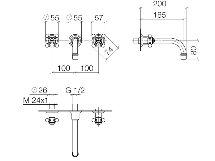 Смеситель для раковины, Dornbracht, Madison, тип открывания воды-вентильный, тип регулирования воды-керамическая кран-букса, монтаж-настенный встраиваемый, отверстия для монтажа-3, высота, мм-80, вынос излива, мм-190, тип излива-неподвижный, донный клапан-отсутствует, тип подводки-жесткая, стандарт подвода воды-1/2", внутренняя часть-необходимо заказать, цвет-хром Смеситель для раковины, Dornbracht, Madison, цвет-хром