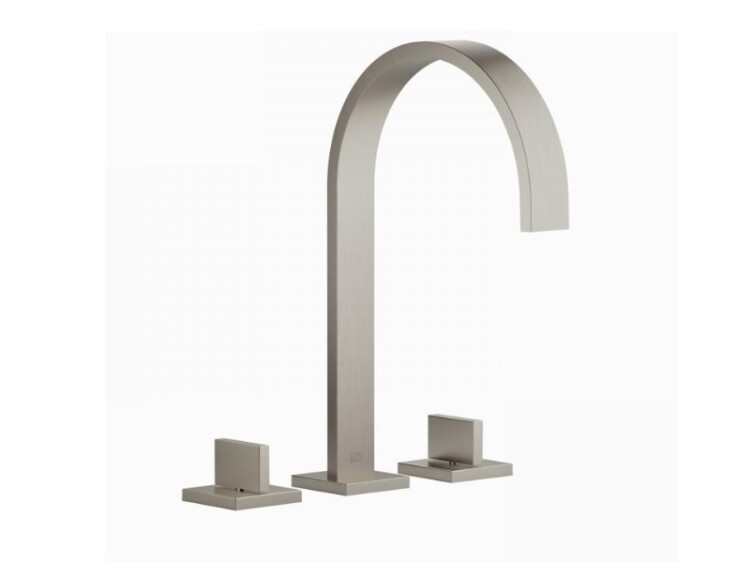 Смеситель для раковины, Dornbracht, MEM, тип открывания воды-двухвентильный, отверстия для монтажа-3, высота, мм-320, вынос излива, мм-200, тип излива-неподвижный, донный клапан-есть, стандарт подвода воды-1/2", цвет-платина матовая, прямоугольная обогащенная воздухом струя Смеситель для раковины, Dornbracht, MEM, цвет-платина матовая