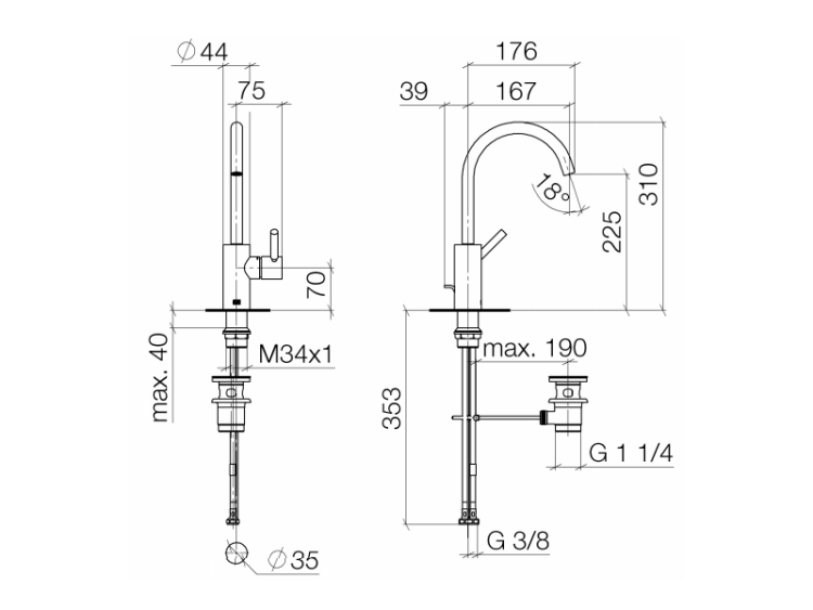 Смеситель для раковины, Dornbracht, Meta, тип открывания воды-однорычажный, отверстия для монтажа-1, высота, мм-310, вынос излива, мм-167, тип излива-поворотный 360°, донный клапан-есть, цвет-платина матовая, только для раковин с переливом Смеситель для раковины, Dornbracht, Meta, цвет-платина матовая