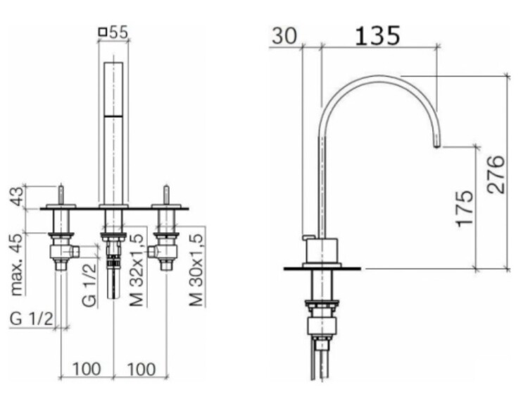 Смеситель для раковины, Dornbracht, Tara, тип открывания воды-двухрычажный, тип регулирования воды-керамический картридж, отверстия для монтажа-3, высота, мм-270, вынос излива, мм-135, тип излива-поворотный 360°, донный клапан-есть, стандарт подвода воды-1/2", цвет-черный матовый Смеситель для раковины, Dornbracht, Tara, цвет-черный матовый