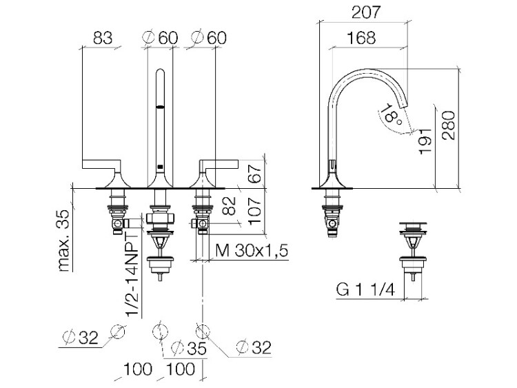 Смеситель для раковины, Dornbracht, Vaia, тип открывания воды-двухрычажный, отверстия для монтажа-3, высота, мм-280, вынос излива, мм-168, тип излива-поворотный 360°, донный клапан-есть, цвет-Dark Platinum matt Смеситель для раковины, Dornbracht, Vaia, цвет-Dark Platinum matt