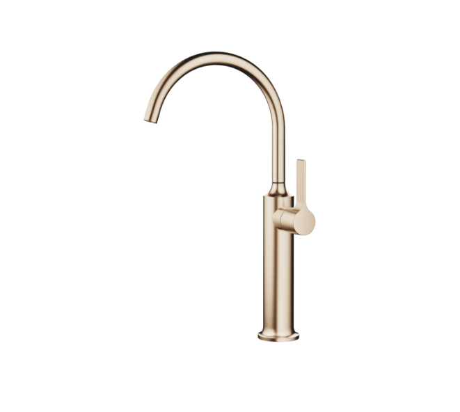 Смеситель для раковины, Dornbracht, Vaia, тип открывания воды-однорычажный, тип регулирования воды-керамический картридж, монтаж-на раковину/столешницу, отверстия для монтажа-1, высота, мм-414, вынос излива, мм-201, тип излива-поворотный, донный клапан-отсутствует, тип подводки-гибкая, стандарт подвода воды-3/8", цвет-шампань сатинированная Смеситель для раковины, Dornbracht, Vaia, цвет-шампань сатинированная