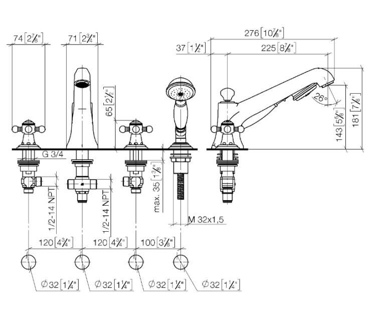 Смеситель для ванны и душа, Dornbracht, Madison, тип открывания воды-вентильный, тип регулирования воды-керамическая кран-букса, монтаж-на борт ванны, отверстия для монтажа-4, вынос излива, мм-225, в комплекте-ручной душ вытяжной, тип струи-compact rain, ручка-белый фарфор, металлический душевой шланг,мм- 1750, автоматическое переключение ванна/душ, внутренняя часть-необходимо заказать, цвет-платина сатинированная (Satin Platinum) Смеситель для ванны и душа, Dornbracht, Madison, цвет-платина сатинированная (Satin Platinum)