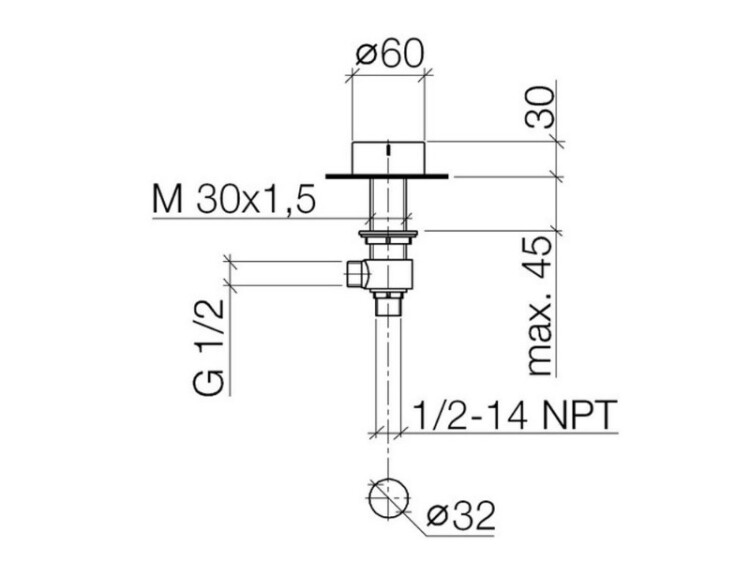 Вентиль, Dornbracht, Deque, тип вентиля-запорный/боковой, запирание-вправо, холодный, керамический картридж 1/2", без розетки, диаметр ручки,мм-60, диаметр сверлёного отверстия,мм-32, цвет-платина матовая Вентиль, Dornbracht, Deque, запирание-вправо, холодный, цвет-платина матовая