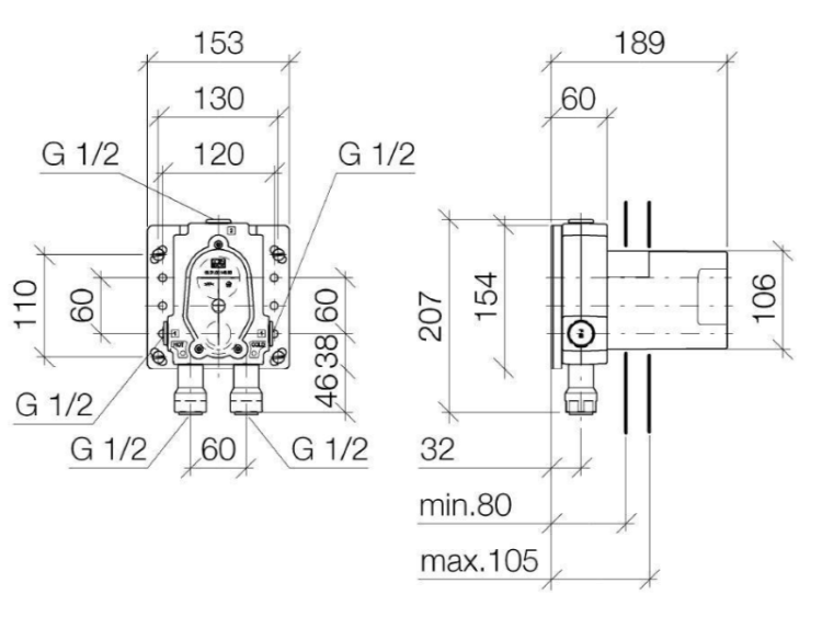 Внутренняя часть смесителя, Dornbracht, 2 предохранителя от обратного потока, элемент настенного монтажа, без содержания свинца, устойчивое цинковое покрытие, отвод G 0,5, ввод G 0,5, устройство предварительного отключения, набор для крепления, защитный кожух, защитная манжета от проникновения воды, звуко- и термоизоляция, крепление для автоматического переключателя, минимальная монтажная глубина 80 - 105 мм, расстояние между осями 60 мм Внутренняя часть, Dornbracht, Универсальная, назначение-для смесителя