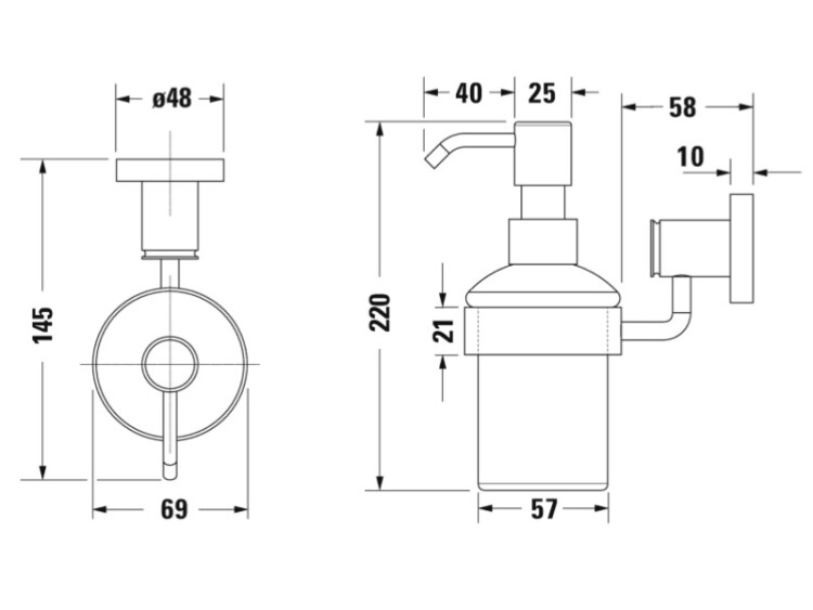 Дозатор для жидкого мыла, Duravit, D-Code, с держателем, ширина, мм-69, глубина, мм-145, высота, мм-220, тип установки-подвесной, материал колбы-матовое стекло, цвет-хром Дозатор для жидкого мыла, Duravit, D-Code, шгв 69*145*220, цвет-хром