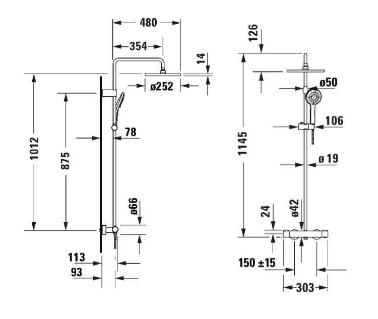 Душевая стойка, Duravit, смеситель-в комплекте, тип регулирования воды-термостатический картридж, верхний душ-есть, форма верхнего душа-круглая, размер верхнего душа,мм-252, держатель верхнего душа-есть, вынос, мм-354, размер штанги, мм-1145, ручной душ и держатель для ручного душа-в комплекте, шланг-есть, размер шланга, мм-1600, цвет-черный матовый Душевая стойка, Duravit, цвет-черный матовый