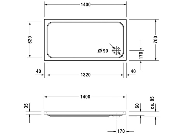 Душевой поддон, Duravit, D-Code, ширина, мм-1400, глубина, мм-700, высота, мм-85, форма-прямоугольная, сифон-необходимо заказать, диаметр слива, мм-90, материал-санитарный акрил, цвет-белый Душевой поддон, Duravit, D-Code, шгв 1400*700*85, цвет-белый