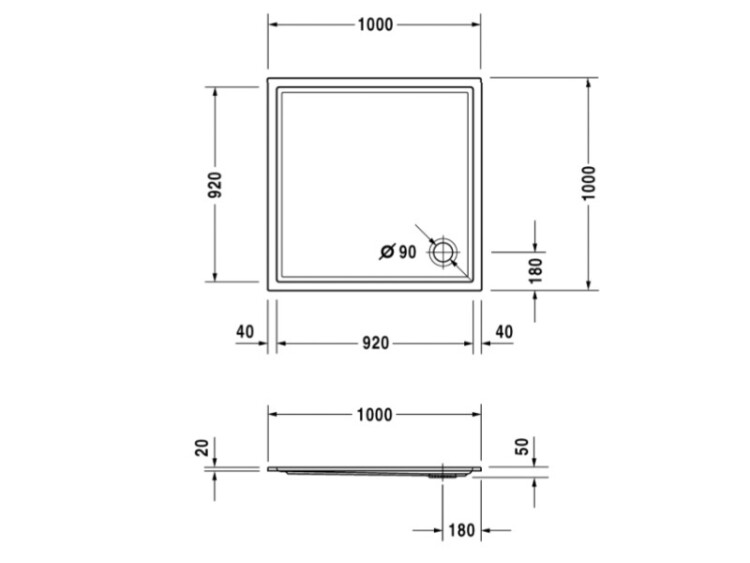 Душевой поддон, Duravit, Starck Slimline, ширина, мм-1000, глубина, мм-1000, высота, мм-50, форма-квадратная, сифон-необходимо заказать, диаметр слива, мм-90, материал-санитарный акрил, цвет-белый Душевой поддон, Duravit, Starck Slimline, шгв 1000*1000*50, цвет-белый