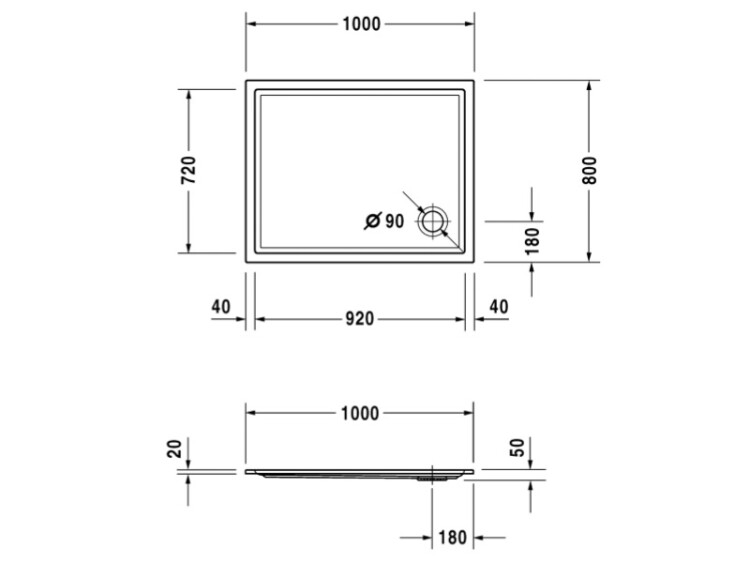 Душевой поддон, Duravit, Starck Slimline, ширина, мм-1000, глубина, мм-800, высота, мм-50, форма-прямоугольная, сифон-необходимо заказать, диаметр слива, мм-90, материал-санитарный акрил, цвет-белый Душевой поддон, Duravit, Starck Slimline, шгв 1000*800*50, цвет-белый