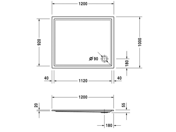 Душевой поддон, Duravit, Starck Slimline, ширина, мм-1200, глубина, мм-1000, высота, мм-55, форма-прямоугольная, сифон-необходимо заказать, диаметр слива, мм-90, материал-санитарный акрил, цвет-белый Душевой поддон, Duravit, Starck Slimline, шгв 1200*1000*55, цвет-белый