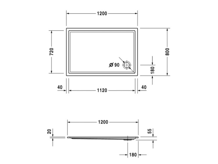 Душевой поддон, Duravit, Starck Slimline, ширина, мм-1200, глубина, мм-800, высота, мм-55, форма-прямоугольная, сифон-необходимо заказать, диаметр слива, мм-90, материал-санитарный акрил, цвет-белый Душевой поддон, Duravit, Starck Slimline, шгв 1200*800*55, цвет-белый