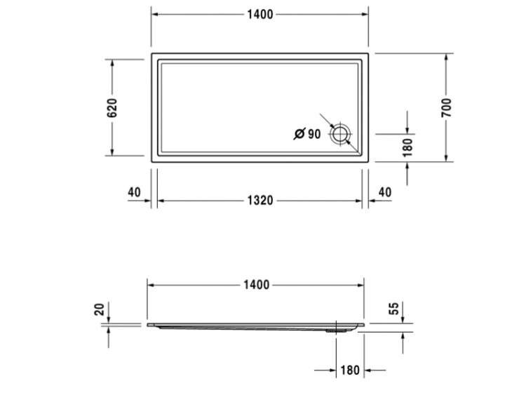 Душевой поддон, Duravit, Starck Slimline, ширина, мм-1400, глубина, мм-700, высота, мм-55, форма-прямоугольная, сифон-необходимо заказать, диаметр слива, мм-90, материал-санитарный акрил, с антислипом, цвет-белый Душевой поддон, Duravit, Starck Slimline, шгв 1400*700*55, с антислипом, цвет-белый