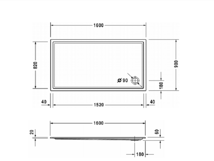 Душевой поддон, Duravit, Starck Slimline, ширина, мм-1600, глубина, мм-900, высота, мм-60, форма-прямоугольная, сифон-необходимо заказать, диаметр слива, мм-90, материал-санитарный акрил, с антислипом, цвет-белый Душевой поддон, Duravit, Starck Slimline, шгв 1600*900*60, с антислипом, цвет-белый