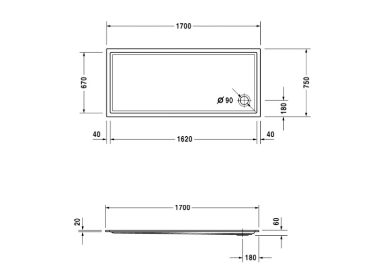 Душевой поддон, Duravit, Starck Slimline, ширина, мм-1700, глубина, мм-750, высота, мм-60, форма-прямоугольная, сифон-необходимо заказать, диаметр слива, мм-90, материал-санитарный акрил, цвет-белый Душевой поддон, Duravit, Starck Slimline, шгв 1700*750*60, цвет-белый
