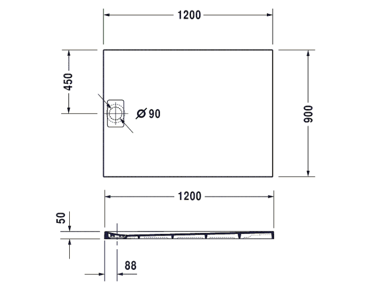 Душевой поддон, Duravit, Stonetto, ширина, мм-1200, глубина, мм-900, высота, мм-50, форма-прямоугольная, диаметр слива, мм-90, ножки-необходимо заказать, материал-DuraSolid Q, цвет-белый Душевой поддон, Duravit, Stonetto, шгв 1200*900*50, цвет-белый