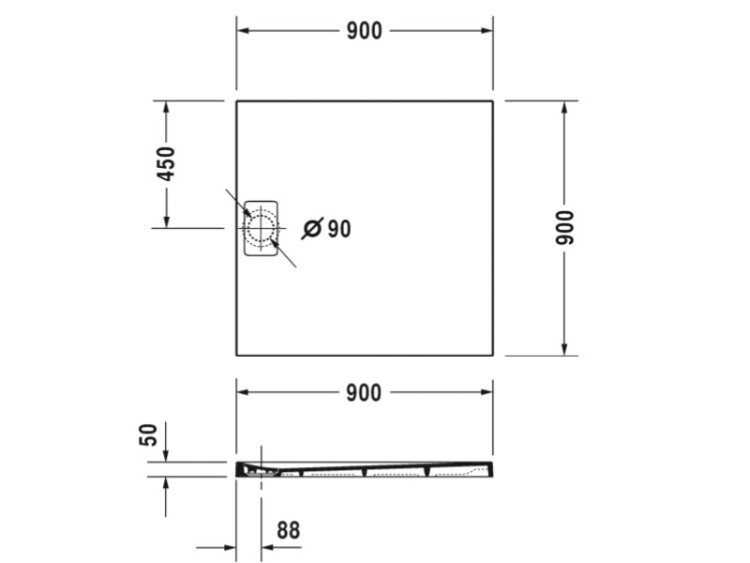 Душевой поддон, Duravit, Stonetto, ширина, мм-900, глубина, мм-900, высота, мм-50, форма-квадратная, диаметр слива, мм-90, ножки-необходимо заказать, опорная рама-необходимо заказать, материал-DuraSolid Q, цвет-белый Душевой поддон, Duravit, Stonetto, шгв 900*900*50, цвет-белый