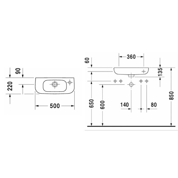 Раковина, Duravit, D-Code, ширина, мм-500, глубина, мм-220, высота, мм-135, отверстия для смесителя-1 справа, перелив-есть, материал-керамика, цвет-белый, глазуровка снизу Раковина, Duravit, D-Code, шгв 500*220*135, отверстия для смесителя-1 справа, цвет-белый