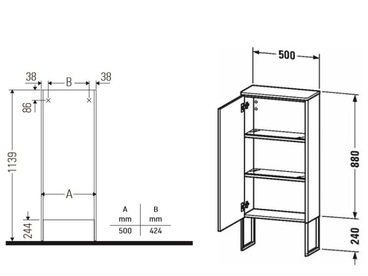 Шкаф-пенал, Duravit, XSquare, ширина, мм-500, глубина, мм-236, высота, мм-880, тип установки-напольный, дверцы-есть, открывание дверей-распашное, петли-слева, материал корпуса-ДСП меламиновая смола, материал фасада-ДСП меламиновая смола, цвет-белый глянцевый, 2 стеклянные полки с алюминиемыми креплениями, встроенные ножки с регулировкой по высоте Шкаф-пенал, Duravit, XSquare, шгв 500*236*880, петли-слева, цвет-белый глянцевый