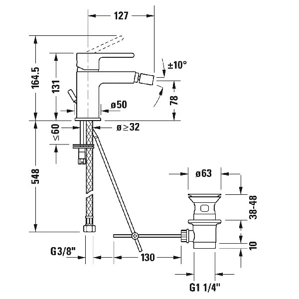 Смеситель для биде, Duravit, B.2, тип открывания воды-однорычажный, тип регулирования воды-керамический картридж, отверстия для монтажа-1, высота, мм-164.5, вынос излива, мм-127, донный клапан-есть, тип подводки-гибкая, стандарт подвода воды-3/8", цвет-хром Смеситель для биде, Duravit, B.2, цвет-хром