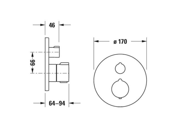 Смеситель для душа, Duravit, B.1, тип открывания воды-однорычажный, тип регулирования воды-термостатический картридж, тип установки-встраиваемый, отверстия для монтажа-2, внутренняя часть-необходимо заказать, цвет-хром, защитная блокировка при 38°C, круглая накладка,мм-Ø 170, переключатель излив ванны/ручной душ, включая-видимые детали с функциональным блоком, рекомендуемое рабочее давление 3-5 бар, с запорным переключателем Смеситель для душа, Duravit, B.1, цвет-хром