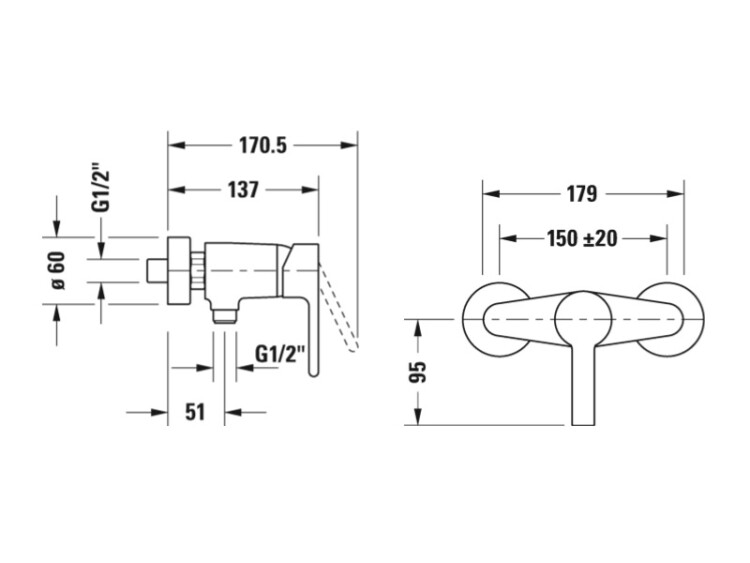 Смеситель для душа, Duravit, B.2, тип открывания воды-однорычажный, тип регулирования воды-керамический картридж, тип установки-настенный, отверстия для монтажа-2, цвет-хром, клапан обратного тока в муфте шланга, переходник для шланга DN15, соединительный патрубок размер DN15 Смеситель для душа, Duravit, B.2, цвет-хром