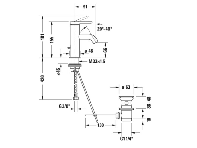 Смеситель для раковины, Duravit, C.1, тип открывания воды-однорычажный, тип регулирования воды-керамический картридж, отверстия для монтажа-1, высота, мм-155, вынос излива, мм-91, донный клапан-есть, тип подводки-гибкая, стандарт подвода воды-3/8", регулируемый аэратор, стандартная струя, цвет-хром Смеситель для раковины, Duravit, C.1, цвет-хром