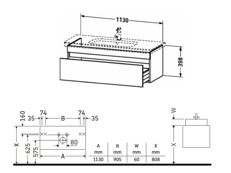 Тумба под раковину, Duravit, Durastyle, ширина, мм-1130, глубина, мм-448, высота, мм-398, тип установки-подвесной, форма мебели-прямоугольная, раковина-необходимо заказать, ящики-1, открывание-выдвижное, материал корпуса-ДСП меламиновая смола, материал фасада-ДСП меламиновая смола, цвет-белый матовый Тумба под раковину, Duravit, Durastyle, шгв 1130*448*398, раковина-необходимо заказать, цвет-белый матовый