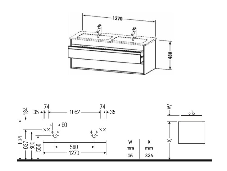 Тумба под раковину, Duravit, Ketho, ширина, мм-1270, глубина, мм-475, высота, мм-480, тип установки-подвесной, форма мебели-прямоугольная, раковина-необходимо заказать, двойную, ящики-2, открывание-выдвижное, материал корпуса-ДСП меламиновая смола, материал фасада-ДСП меламиновая смола, цвет-орех натуральный, верхний ящик с вырезом и крышкой для сифона Тумба под раковину, Duravit, Ketho, шгв 1270*475*480, раковина-необходимо заказать, цвет-орех натуральный