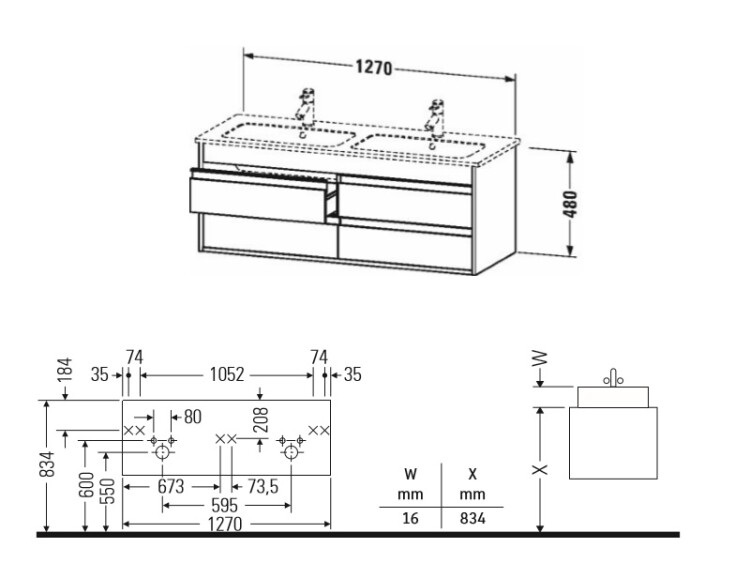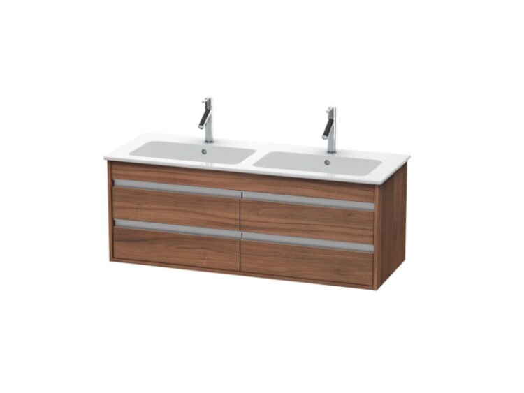 Тумба под раковину, Duravit, Ketho, ширина, мм-1270, глубина, мм-475, высота, мм-480, тип установки-подвесной, форма мебели-прямоугольная, раковина-необходимо заказать, двойную, ящики-4, открывание-выдвижное, материал корпуса-ДСП меламиновая смола, материал фасада-ДСП меламиновая смола, цвет-орех натуральный, верхний ящик с вырезом и крышкой для сифона Тумба под раковину, Duravit, Ketho, шгв 1270*475*480, раковина-необходимо заказать, цвет-орех натуральный