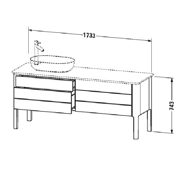 Тумба под раковину, Duravit, Luv, ширина, мм-1733, глубина, мм-570, высота, мм-743, тип установки-напольный, форма мебели-прямоугольная, раковина-необходимо заказать, ящики-4, открывание-выдвижное, комплектация-вырез под сифон, крышка сифона, материал корпуса-высокоплотная трехслойная ДСП, цвет корпуса-белый шелковисто-матовый, материал фасада-высокоплотная трехслойная ДСП, цвет-белый шелковисто-матовый, декор-без декора Тумба под раковину, Duravit, Luv, шгв 1733*570*743, раковина-необходимо заказать, цвет-белый шелковисто-матовый