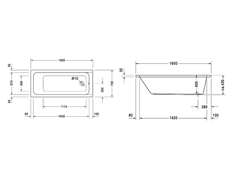Ванна, Duravit, D-Code, ширина, мм-1600, глубина, мм-700, высота, мм-400, водоизмещение (л)-100, тип установки-встраиваемый, форма-прямоугольная, слив-перелив-необходимо заказать, диаметр слива, мм-52, ножки-необходимо заказать, материал-санитарный акрил, цвет-белый, с одним наклоном для спины, выпуск в зоне ног Ванна, Duravit, D-Code, шгв 1600*700*400, цвет-белый