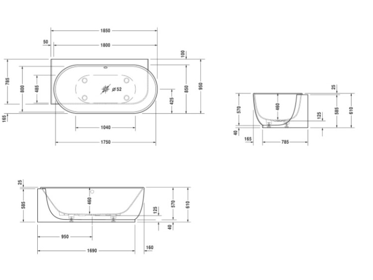 Ванна, Duravit, Luv, ширина, мм-1850, глубина, мм-950, высота, мм-460, водоизмещение (л)-252, тип установки-пристенный/угловой, угол слева, форма-овальная, панель-есть, бесшовная, слив-перелив-необходимо заказать, диаметр слива, мм-52, ножки-есть, материал-DuraSolid A, цвет-белый, с двумя наклонами для спины Ванна, Duravit, Luv, шгв 1850*950*460, цвет-белый