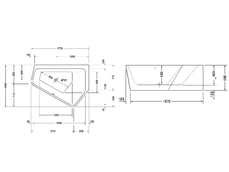 Ванна, Duravit, Paiova, ширина, мм-1770, глубина, мм-1300, высота, мм-440, водоизмещение (л)-205, тип установки-пристенный/угловой, форма-пятиугольная, панель-есть, слив-перелив-необходимо заказать, диаметр слива, мм-52, ножки-есть, материал-акрил, цвет-белый Ванна, Duravit, Paiova, шгв 1770*1300*440, цвет-белый
