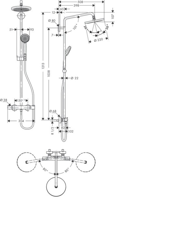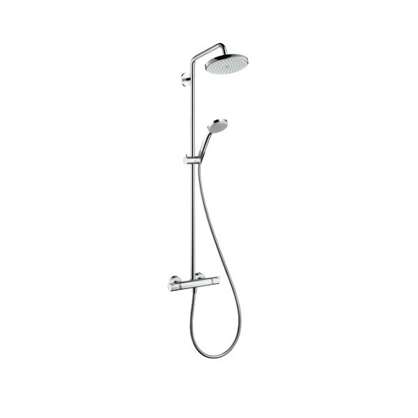 Душевая стойка, Hansgrohe, Croma, тип регулирования воды-термостатический картридж, верхний душ-есть, форма верхнего душа-круглая, размер верхнего душа-220, держатель верхнего душа-есть, вынос, мм-400, количество режимов верхнего душа-1, тип струи верхнего душа-RainAir, размер ручного душа-120, количество режимов ручного душа-5, тип струи ручного душа-Rain, Shampoo, обычная, каскад, массажная, шланг-есть, размер шланга, мм-1600, цвет-хром Душевая стойка, Hansgrohe, Croma, 220, цвет-хром