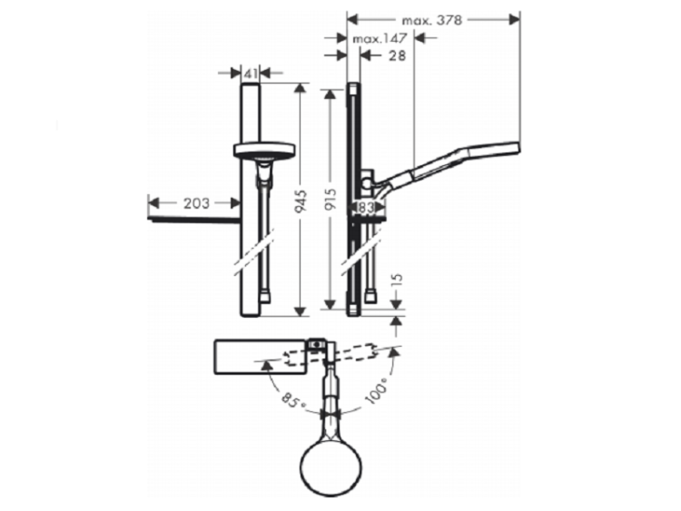 Душевой гарнитур, Hansgrohe, Rainfinity, размер штанги, мм-900, ширина штанги,мм-41, тип душевой штанги-плоский алюминиевый профиль с покрытием из безопасного стекла, диаметр ручного душа, мм-130, переключение типов струи с помощью кнопки Select, количество режимов-3, тип струи-PowderRain, Intense PowderRain, MonoRain, цвет-хром, в комплекте-шланг для душа, со стороны душа упорный подшипник, предотвращающий перекручивание, ползунок, регулируется в пределах 90°, поворачивается вправо и влево, перемещается вверх и вниз, мыльница из безопасного стекла, полностью хромированный, настенные крепления из пластика Душевой гарнитур, Hansgrohe, Rainfinity, цвет-хром
