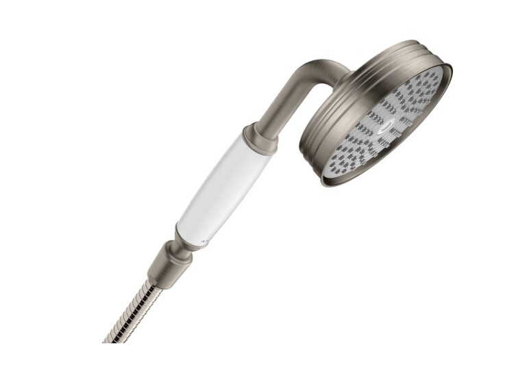 Ручной душ, Hansgrohe, Axor Montreux, размер душевого диска, мм-100, форма-круглая, количество режимов-1, тип струи-RainAir, цвет-сталь, с белой рукояткой, промывающийся грязеулавливающий фильтр, соединительная резьба G ½ Ручной душ, Hansgrohe, Axor Montreux, 100, цвет-сталь