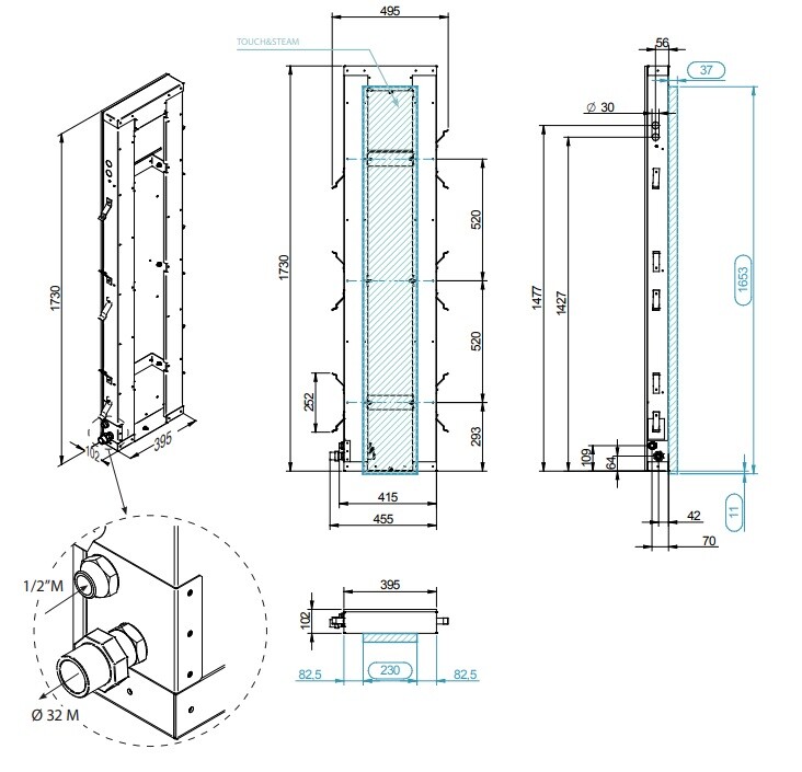 Парогенератор, Effegibi, Touch&Steam 60, 230*37*1650 мм, парогенератор, система автоматической очистки нагревателя, система контроля уровня воды, система автоматического слива, автоматическая функция энергосбережения, сенсорная панель управления с символами с задней подстветкой и индикатором температуры, система подачи пара с усиленной вентиляцией(power steam), система обогрева с усиленной вентиляцией с функцией предварительного обогрева помещения(caldo doccia),контейнер для эссенций, светильник на светодиодах с хромотерапией белый свет + 5 фиксированных цветов + 4 цикла, производительность пара 8,9 кг/час, объем помещения 4,5 - 6,2 м3, мощность 6 кВт макс., материал: каленое стекло с шелкографией, окрашенный аллюминий Парогенератор 230*37*1650 мм