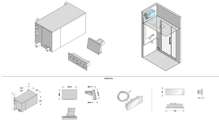 Парогенератор, Effe, Nuvola Smart Power 55, ширина, мм-520, глубина, мм-260, высота, мм-270, объем помещения, м3-4,5-5,5, мощность, кВт-5,5, напряжение, В-230 В одна фаза/400 В три фазы, производительность пара, кг/час-8,1, сенсорная панель управления с символами с задней подстветкой и индикатором температуры, функции парогенератора-RWF Regulating water flow автоматический регулятор давления воды, SWF Smart Water Filling Оптимизированное управление заполнения бойлера, SBC Smart Boiler Cleaning система производящая очистку нагревателя при необходимости и после каждого сеанса, SEC Smart Energy Control равномерное распределение во времени циклов включения и выключения нагревательных элементов, ODS Open Door Sensor датчик состояния двери (открыто/закрыто), ECC - Effe Comfort Control - система дистанционного управления турецкой баней при помощи специального приложения Effigibi Experience для планшетов или смартфонов, поддон для направления воды к сливу, распылитель пара-есть 1 шт, с контейнером для ароматических эссенций, светодиодная подсветка места выхода пара, дополнительный температурный датчик, монтажную коробку для панели управления и корпус для распылителя-необходимо заказать, материал-металл, цвет-белый Парогенератор, Effe, Nuvola Smart Power 55, шгв 520*260*270, распылитель пара, сенсорная панель, цвет-белый