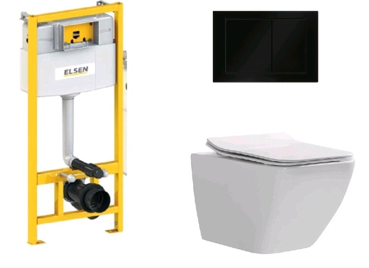 Комплект, ELSEN, E05, унитаз, безободковый (с открытым смывным краем), тип установки-подвесной, ширина, мм-360, глубина, мм-530, высота, мм-365, форма чаши-прямоугольная, выпуск-универсальный, материал-керамика, крепления в комплекте, цвет унитаза-белый, сиденье-в комплекте, тип шарниров-с плавным опусканием SoftClose, материал шарниров-металл, цвет шарниров-хром, материал сиденья-дюропласт, цвет сиденья-белый, инсталляция, тип установки инсталляции-к стене, размер инсталляции (шгв, мм)-500*155*1120, материал инсталляции-металл/пластик, объем смыва, л-3/6, клавиша смыва-есть, тип смыва-двойной, тип управления-механический, материал клавиши-пластик, цвет клавиши-черный матовый Комплект, ELSEN, E05, унитаз подвесной, шгв 360*530*365 + инсталляция + клавиша смыва, цвет унитаза-белый, цвет клавиши-черный матовый