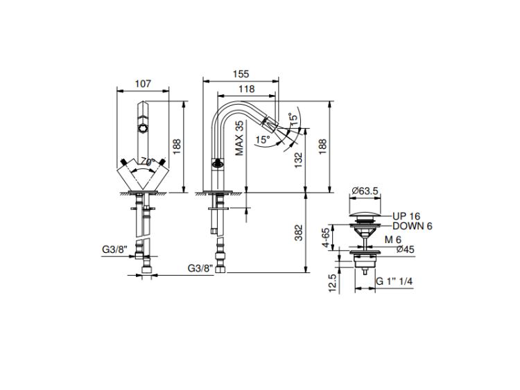 Смеситель для биде, Fantini, Venezia, тип открывания воды-двухвентильный, отверстия для монтажа-1, высота, мм-188, вынос излива, мм-120, донный клапан-есть, цвет-хром Смеситель для биде, Fantini, Venezia, цвет-хром