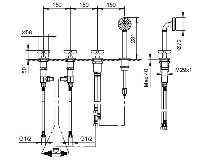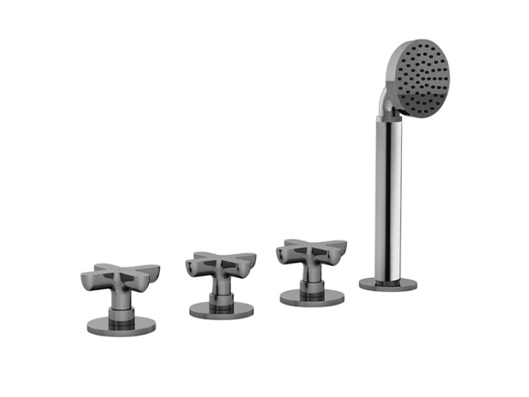 Смеситель для душа, Fantini, Icona Classic, тип открывания воды-вентильный, тип регулирования воды-керамический картридж, тип установки-на борт ванны, отверстия для монтажа-4, цвет-Matt British Gold PVD, в комплекте-ручки, переключатель на 2 потока, ручной душ, форма лейки-круглая, диаметр,мм-72, шланг,мм-1500, впуски 1/2'', подводка Смеситель для душа, Fantini, Icona Classic, цвет-Matt British Gold PVD