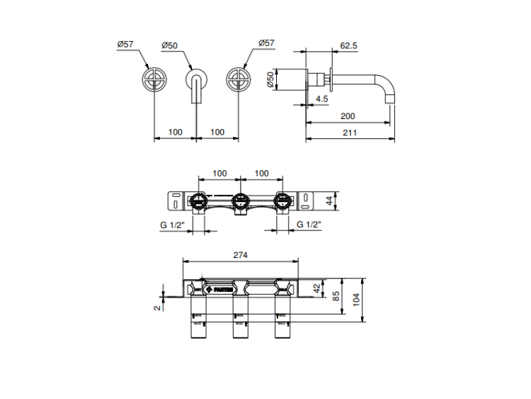 Смеситель для раковины, Fantini, Fontane Bianche, тип открывания воды-двухвентильный, тип регулирования воды-керамический картридж, тип установки-настенный, отверстия для монтажа-3, вынос излива, мм-200, внутренняя часть-необходимо заказать, цвет-Matt Gun Metal PVD Смеситель для раковины, Fantini, Fontane Bianche, цвет-Matt Gun Metal PVD