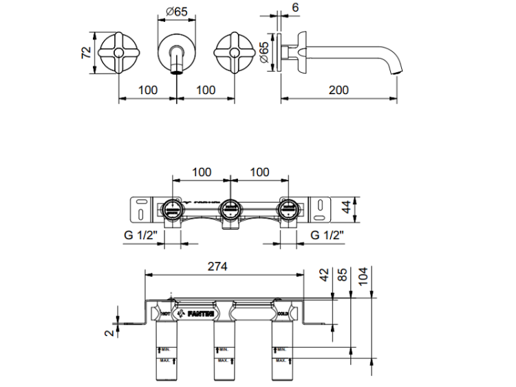 Смеситель для раковины, Fantini, Icona Classic, тип открывания воды-двухвентильный, тип регулирования воды-картридж с керамическими дисками, тип установки-настенный, отверстия для монтажа-3, вынос излива, мм-200, внутренняя часть-необходимо заказать, цвет-Matt British Gold PVD Смеситель для раковины, Fantini, Icona Classic, цвет-Matt British Gold PVD