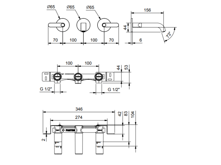 Смеситель для раковины, Fantini, Icona Deco, тип открывания воды-двухрычажный, тип регулирования воды-керамический картридж, тип установки-настенный, отверстия для монтажа-3, вынос излива, мм-150, внутренняя часть-необходимо заказать, цвет-Matt British Gold PVD Смеситель для раковины, Fantini, Icona Deco, цвет-Matt British Gold PVD