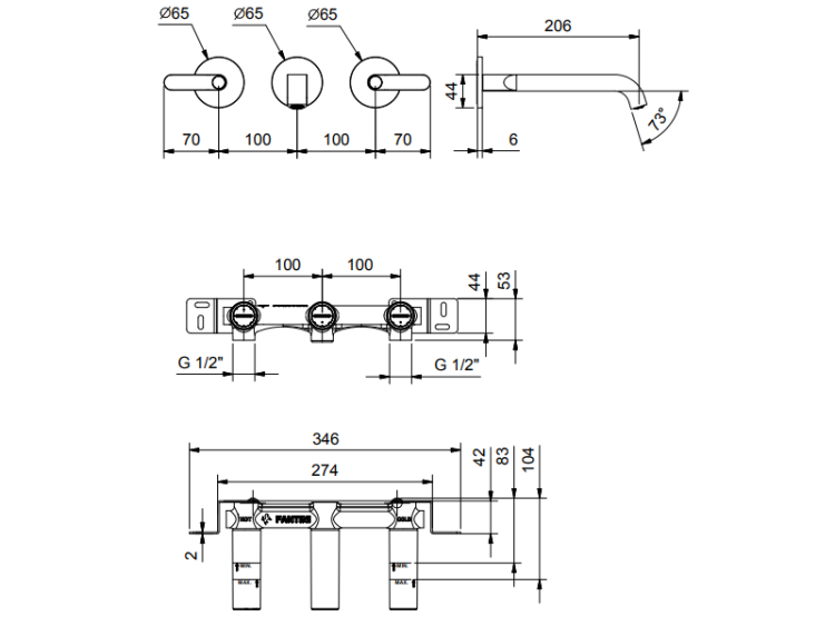 Смеситель для раковины, Fantini, Icona Deco, тип открывания воды-двухрычажный, тип регулирования воды-керамический картридж, тип установки-встраиваемый, отверстия для монтажа-3, вынос излива, мм-200, стандарт подвода воды-1/2", внутренняя часть-необходимо заказать, цвет-Matt Gun Metal PVD Смеситель для раковины, Fantini, Icona Deco, цвет-Matt Gun Metal PVD