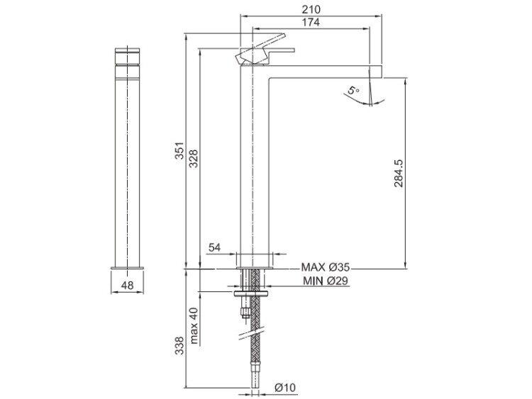 Смеситель для раковины, Fantini, Mare, тип открывания воды-однорычажный, тип регулирования воды-традиционный картридж, отверстия для монтажа-1, высота, мм-328, вынос излива, мм-175, тип излива-высокий, цвет-черный матовый, в комплекте-ручка, подводка Смеситель для раковины, Fantini, Mare, цвет-черный матовый