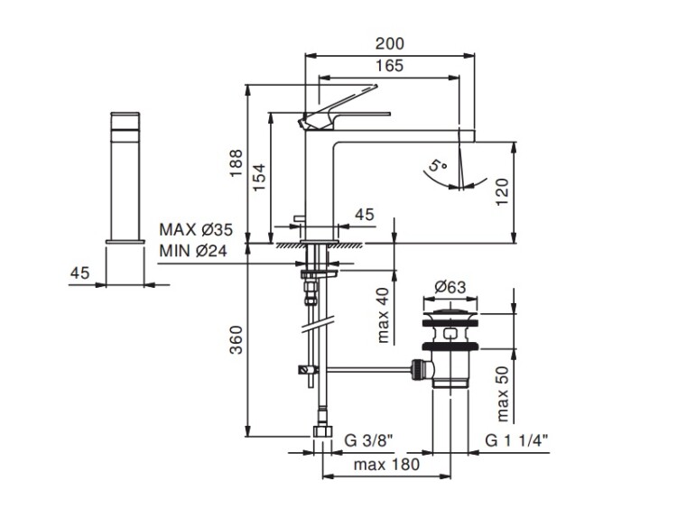 Смеситель для раковины, Fantini, Mint, тип открывания воды-однорычажный, тип регулирования воды-традиционный картридж, отверстия для монтажа-1, высота, мм-154, вынос излива, мм-165, тип излива-удлиненный, донный клапан-есть, тип подводки-гибкая, стандарт подвода воды-3/8", цвет-хром, в комплекте-ручка Смеситель для раковины, Fantini, Mint, цвет-хром