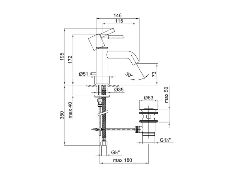 Смеситель для раковины, Fantini, Nostromo, тип открывания воды-однорычажный, тип регулирования воды-традиционный картридж, отверстия для монтажа-1, высота, мм-172, вынос излива, мм-115, донный клапан-есть, тип подводки-гибкая, стандарт подвода воды-3/8", цвет-черный матовый, в комплекте-ручка Смеситель для раковины, Fantini, Nostromo, цвет-черный матовый